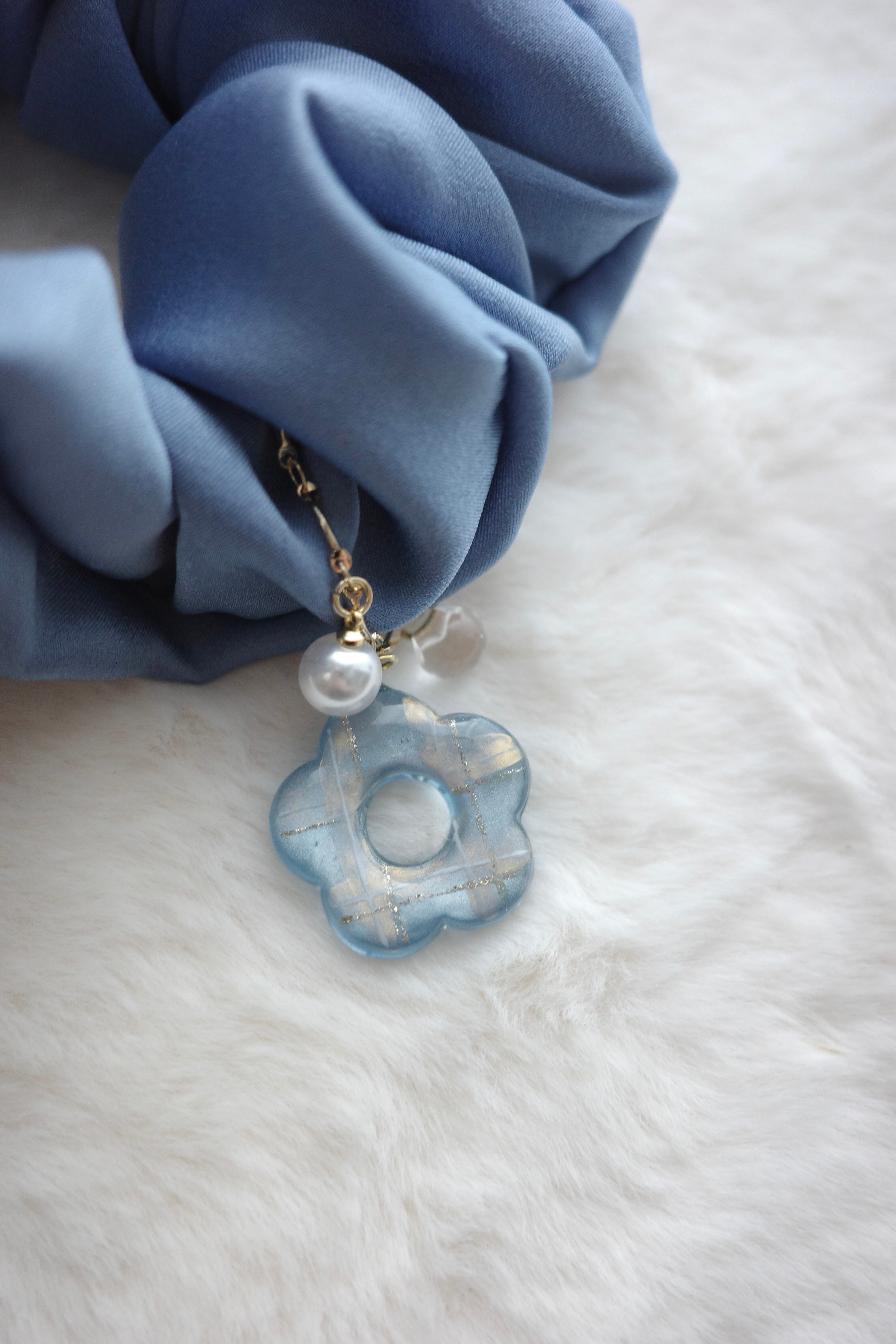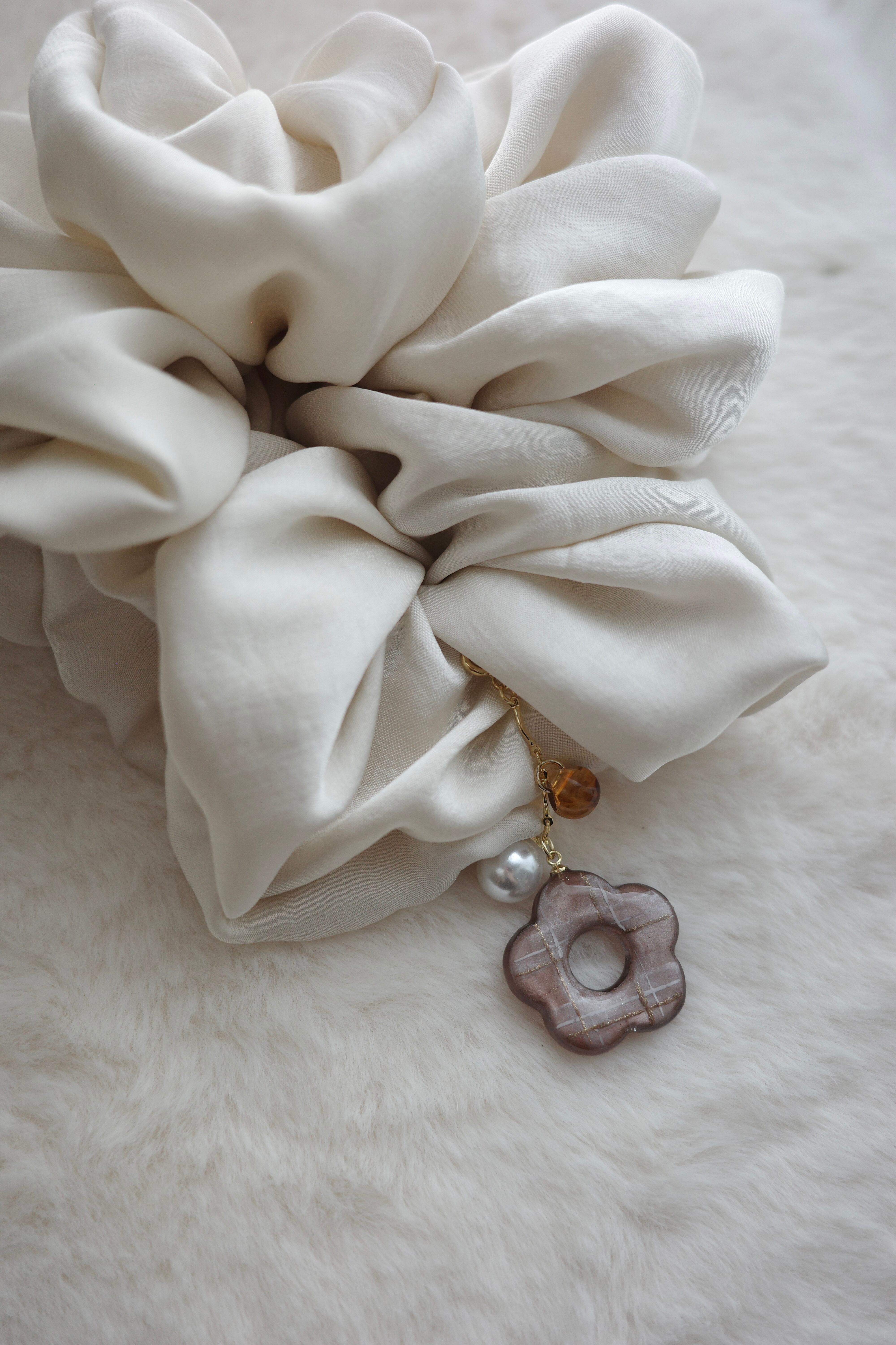 透明感のあるレジンパーツと生地の光が重なり、上品で大人可愛い雰囲気に仕上げました。